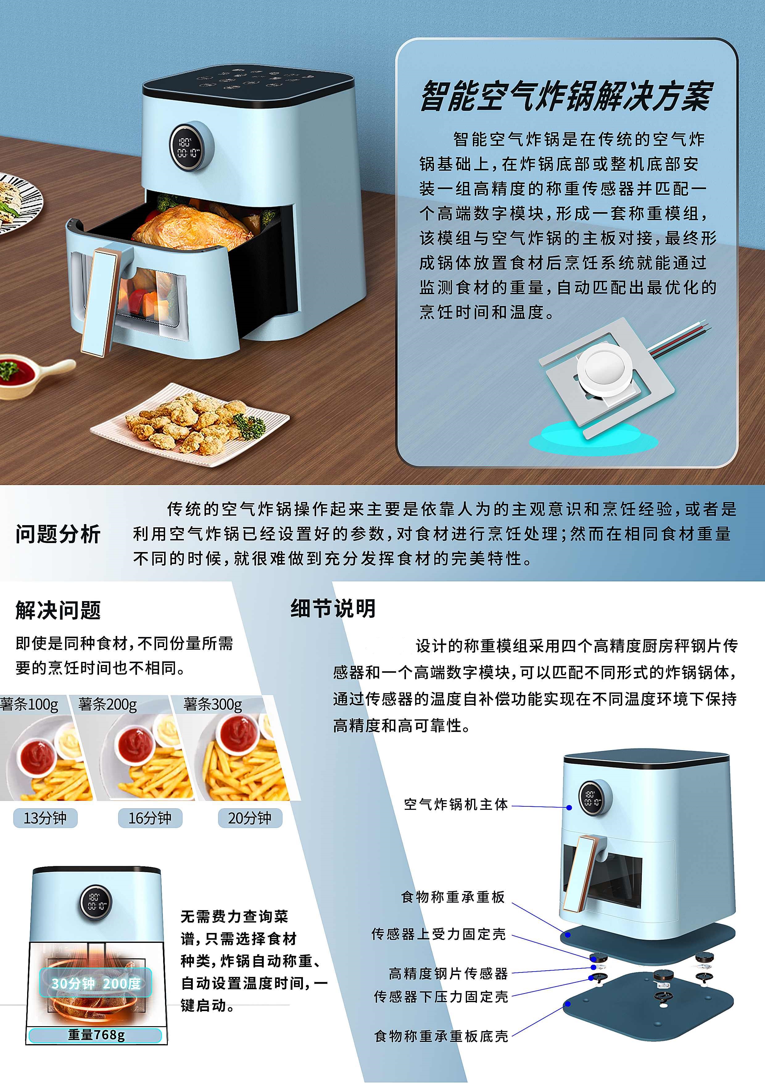 智能空气炸锅是在传统的空气炸锅基础上,在炸锅底部或整机底部安装一组高精度的称重传感器并匹配一个高端数字模块,形成一套称重模组,该模组与空气炸锅的主板对接,最终形成锅体放置食材后烹饪系统就能通过监测食材的重量,自动匹配出最优化的烹饪时间和温度。